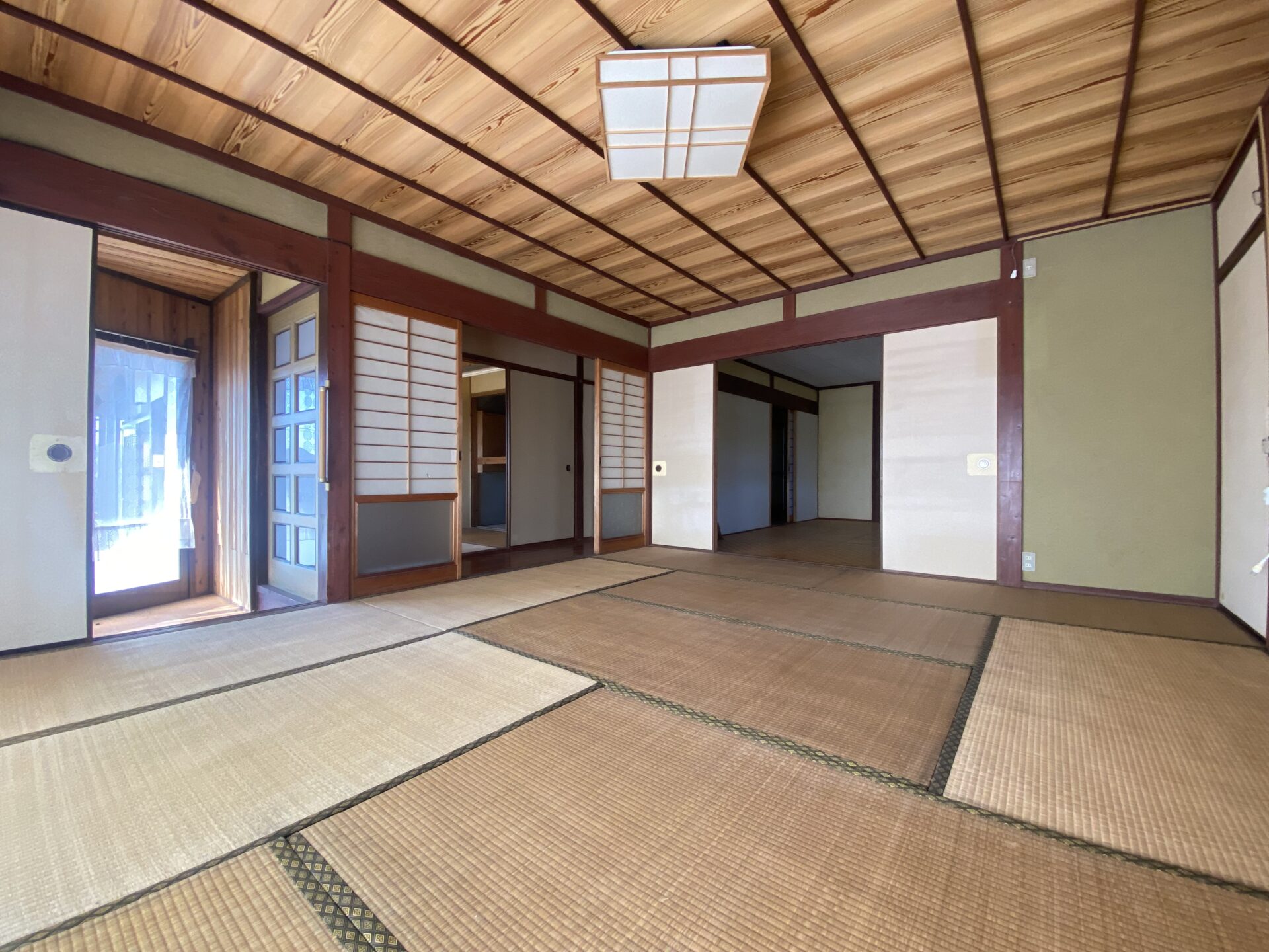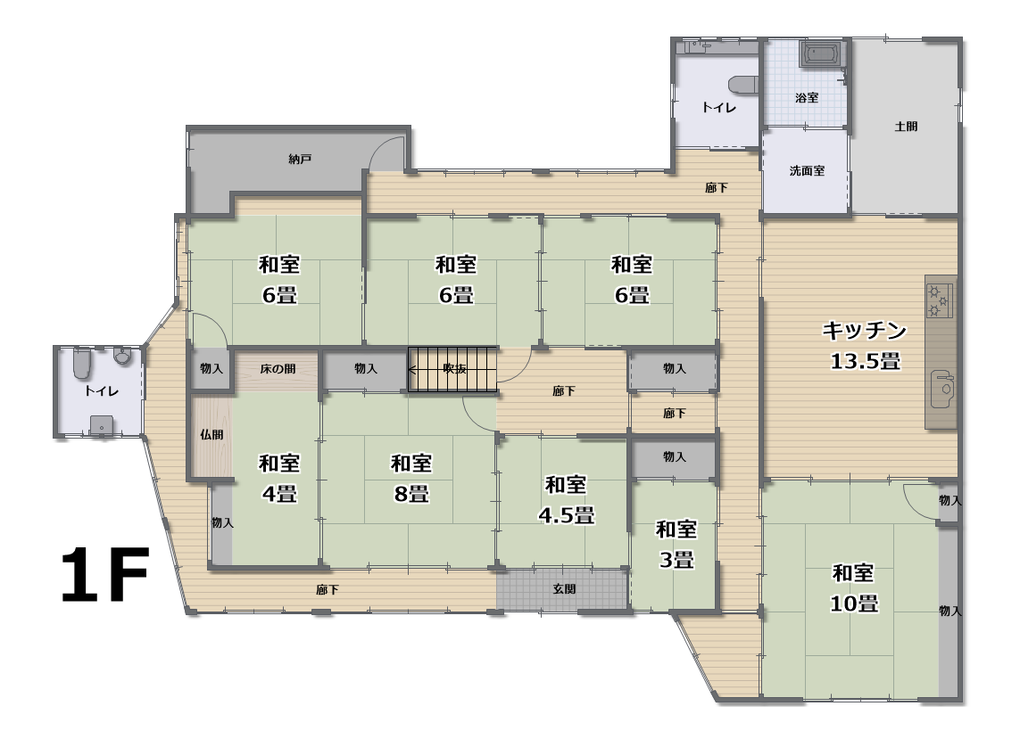 1F:キッチン13.5畳 和室6畳×3部屋 和室10畳 和室8畳 和室4畳 和室4.5畳 和室3畳 物入 トイレ2ヶ所 洗面室 浴室 土間