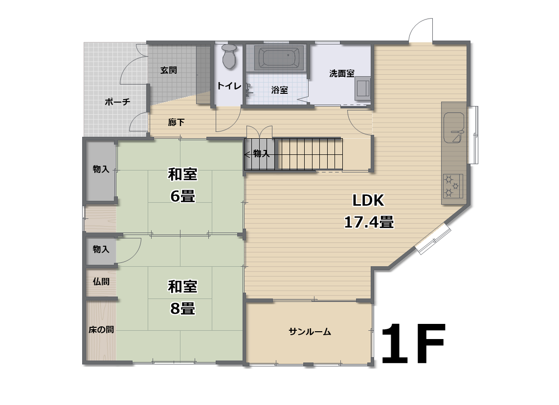 1F:LDK17.4畳 和室6畳 和室6畳 サンルーム 物入 洗面室 浴室 トイレ