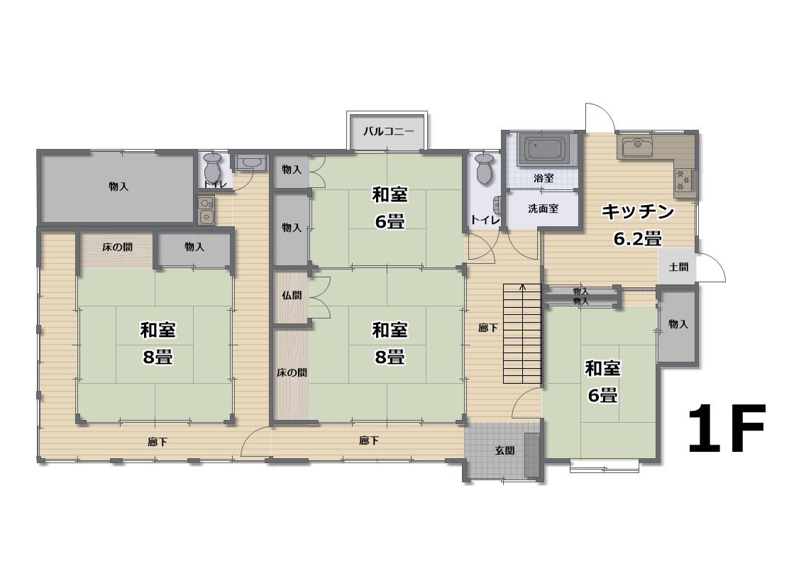 1F:和室8畳 和室8畳 和室6畳 和室6畳 キッチン6.2畳 浴室 トイレ 物置