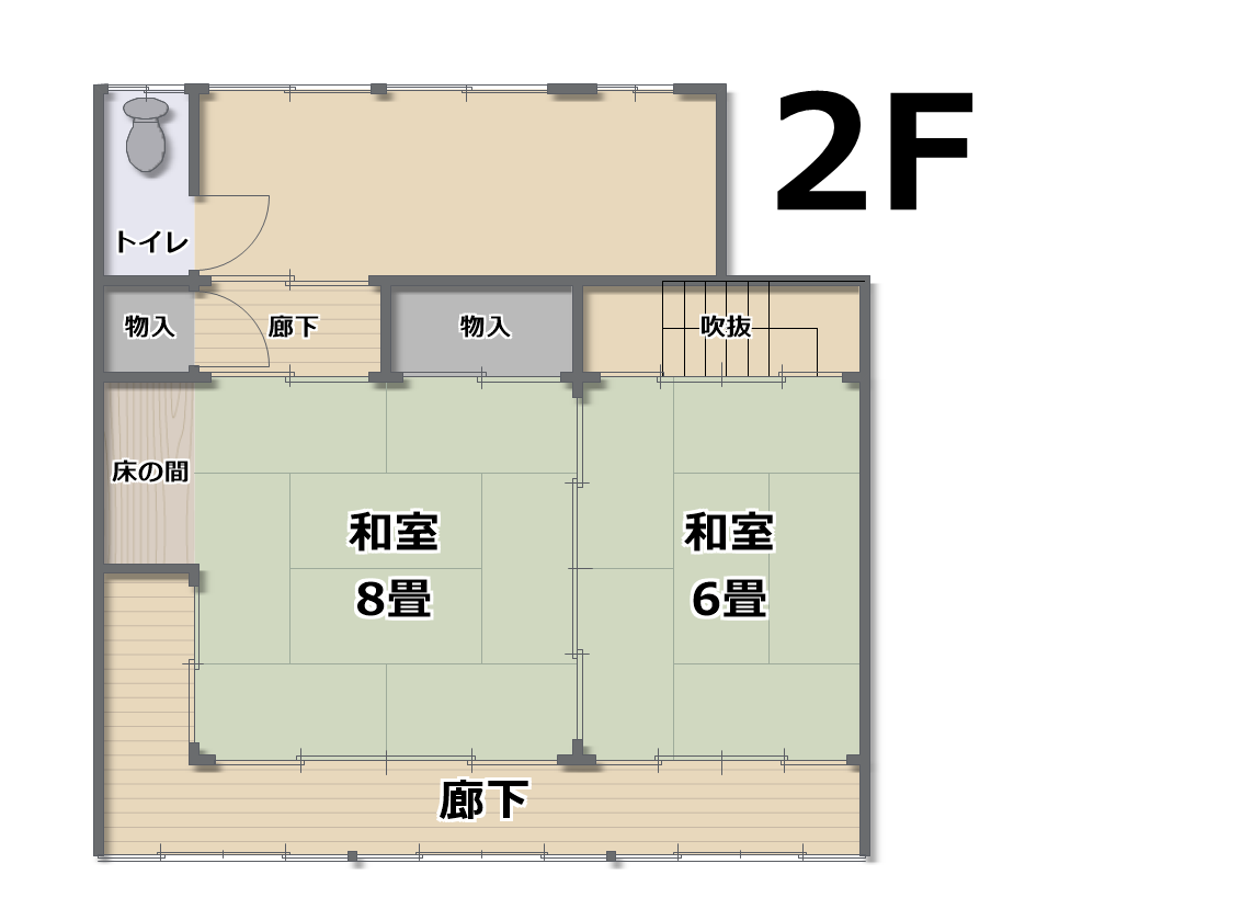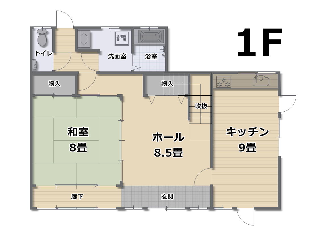 1F:キッチン9畳 ホール8.5畳 和室8畳 物入 トイレ 浴室 洗面室 2F:和室8畳 和室6畳 トイレ 物入