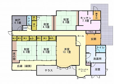 キッチン4.5畳 和室13.1畳 和室8.0畳×3 和室4.5畳 納戸4.5畳 サービスルーム トイレ2ヶ所 浴室 テラス 広縁 押入